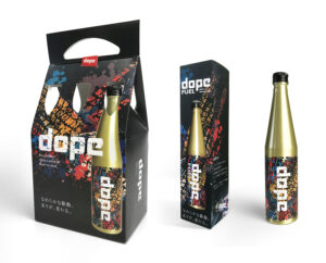 お客様名:パキラ様制作内容:燃料添加剤「DOPE FUEL」商品ラベル、1本用/6本用パッケージ※その他、ポスターや販促品など関連商品のデザインもご依頼いただきました。