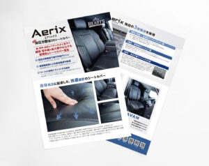 お客様名:FEEL様制作内容:『Aerixシートカバー』チラシ・ポスターサイズ:A4両面チラシ、A1ポスター用途:東京オートサロン2026 にて配布、展示